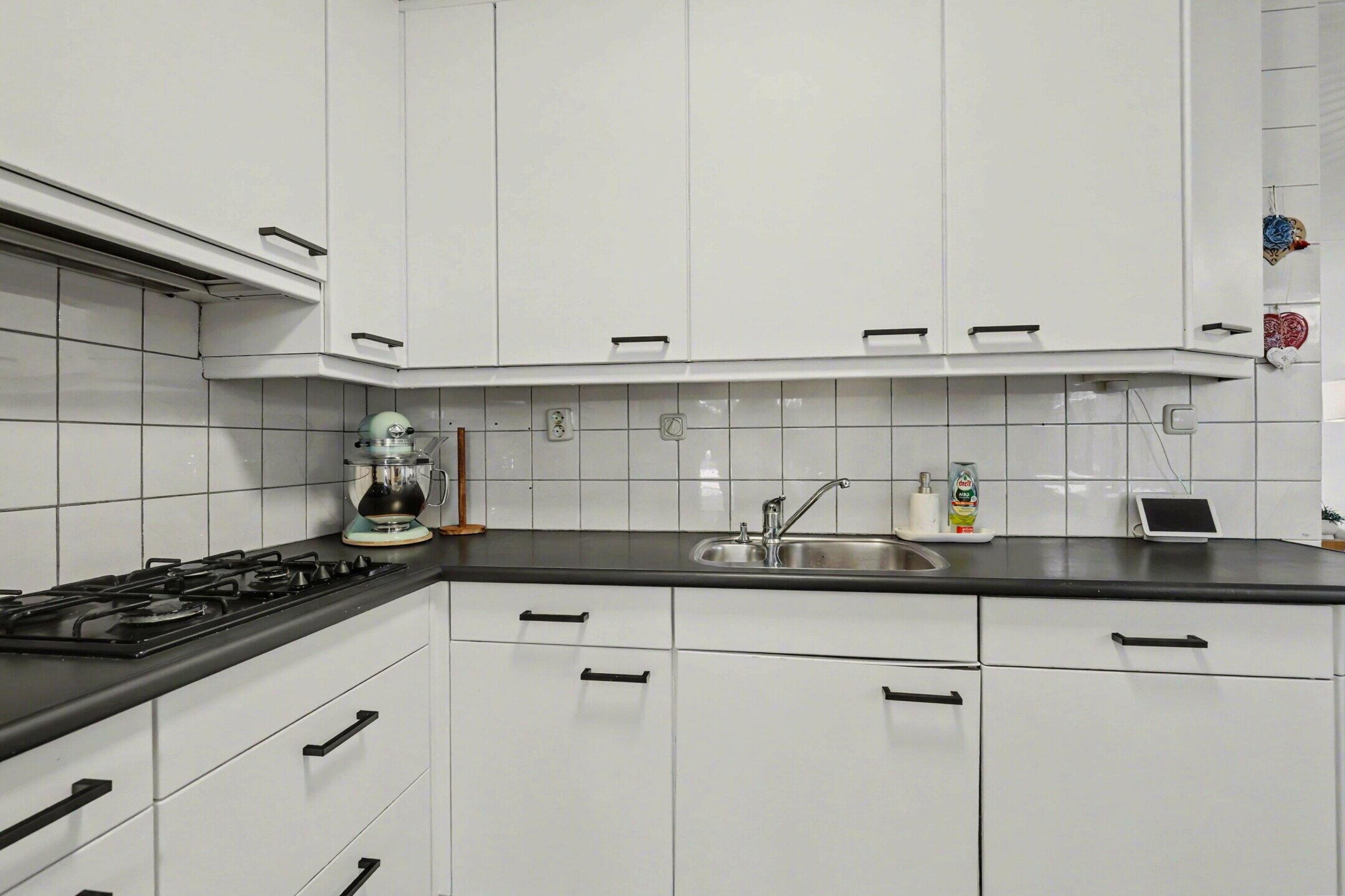 De keuken is praktisch ingericht en voorzien van een koelkast, vaatwasser, oven en gasfornuis.