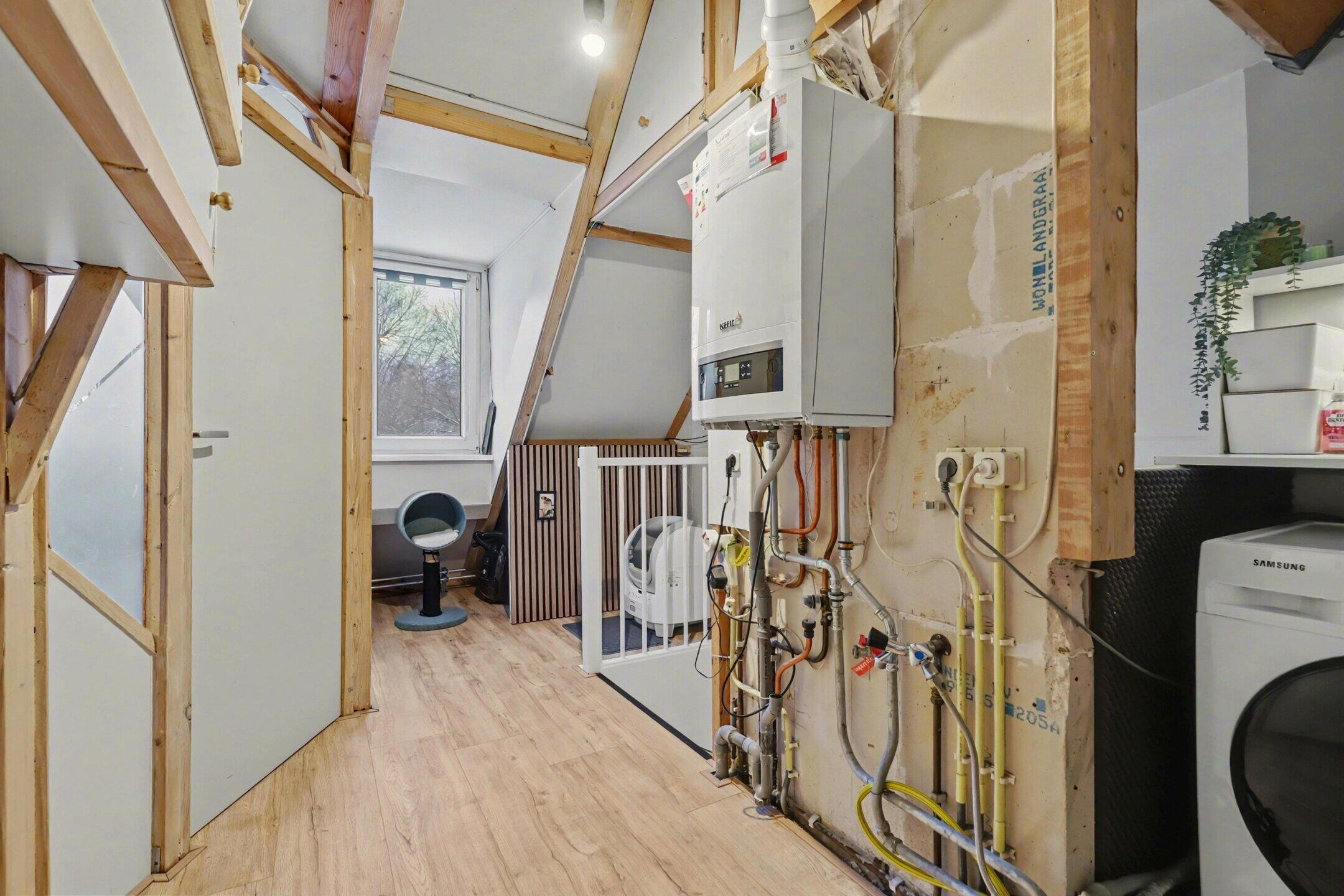 Overloop met opstelling voor de CV-ketel (huur, Volta), mechanische ventilatie en wasmachine