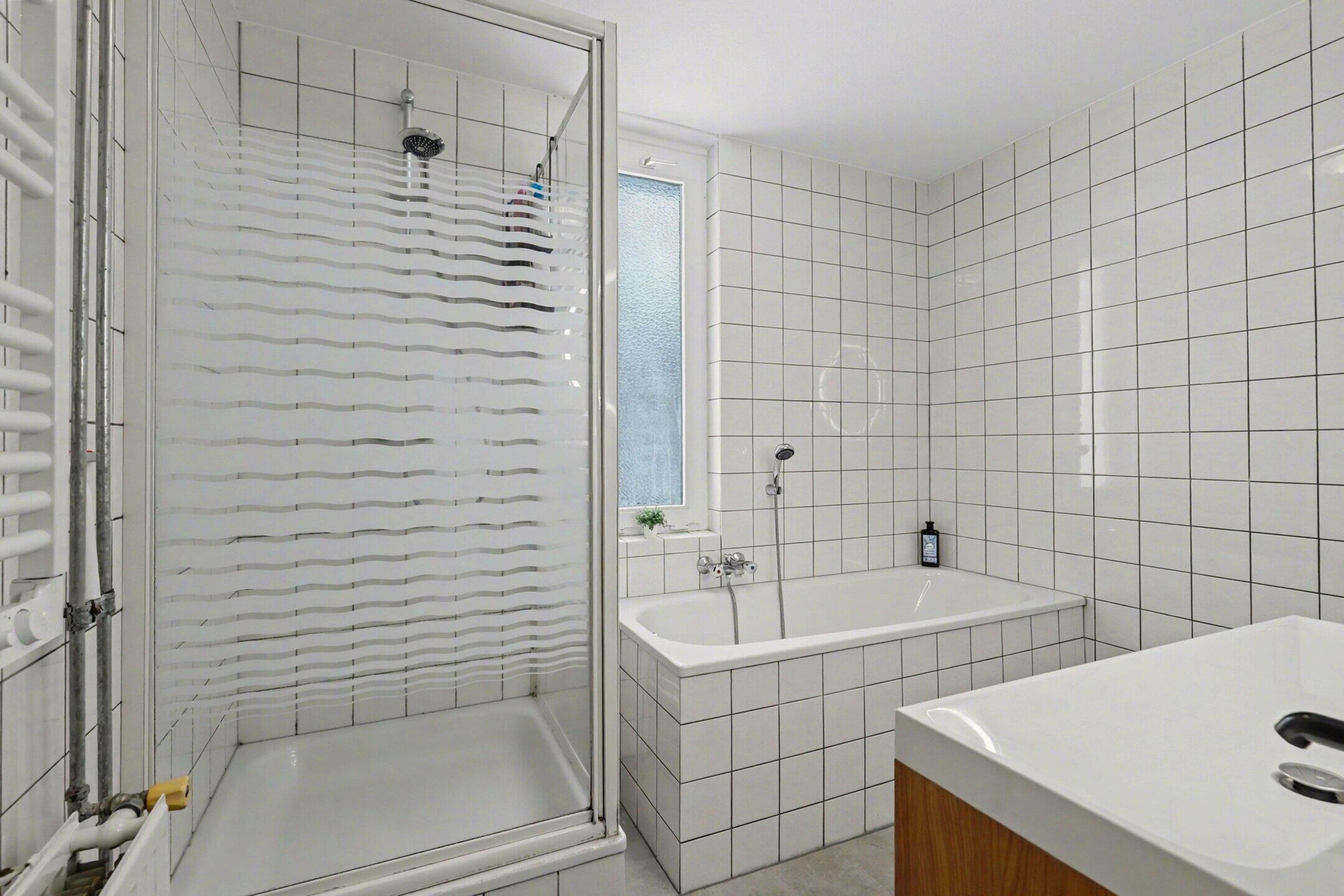 De badkamer is compleet uitgevoerd en voorzien van een douche, ligbad, dubbele wastafel en toilet.