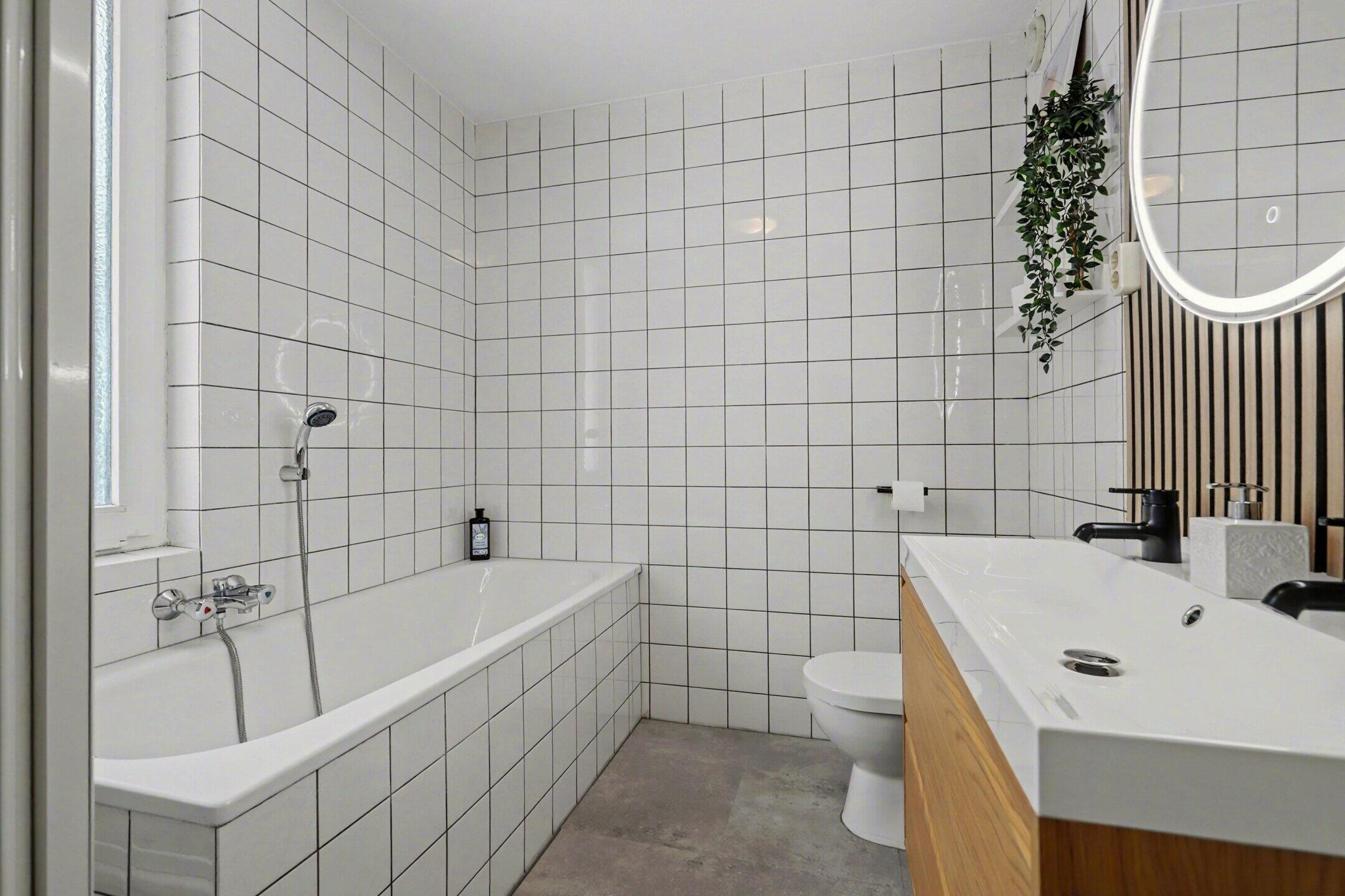 - Ligbad, dubbele wastafel, douche, toilet, wastafelmeubel