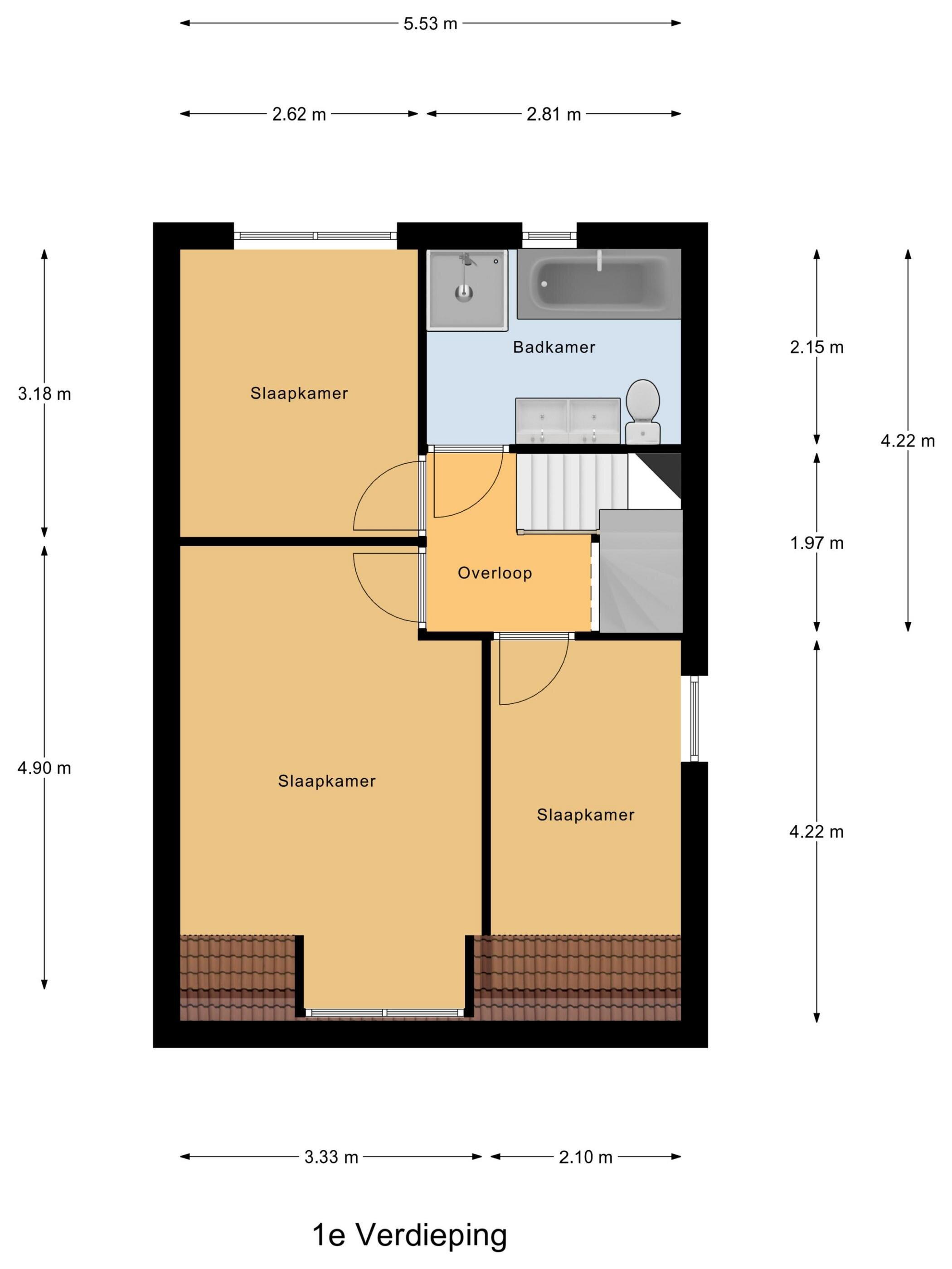 Op de eerste verdieping bevinden zich drie slaapkamers en de badkamer: